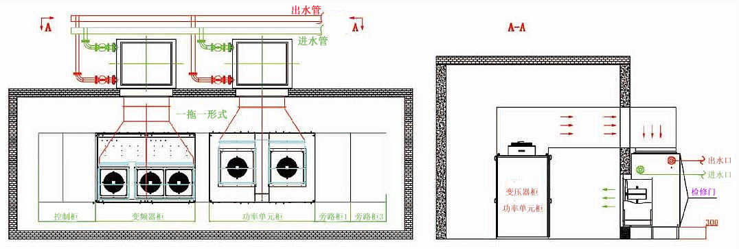 以單套空水冷卻器為例,按照變頻器額定功率6900kW,運行-率96%進行計算,6900kW的變頻器的-大散熱功率為6900×0.4%=276kW,由于空水冷卻器將變頻器排出的熱風(fēng)全部通過空水冷卻器實現(xiàn)了熱交換,然后將冷風(fēng)徘徊室內(nèi),因此其風(fēng)路循環(huán)-率得到-大提高。風(fēng)路循環(huán)-率接近99%,考慮到-限運行情況下的發(fā)熱量,以及水溫偏高,系統(tǒng)交換-率等因素,空水冷卻器的設(shè)計裕度通-選擇為1.15~1.2倍,即:變頻器空水冷卻裝置的熱交換功率不小于317kW/套,實際選用冷卻功率為320kW空水冷卻器,每臺變頻器總冷卻風(fēng)量計算公式為:單臺風(fēng)機風(fēng)量×風(fēng)機臺數(shù),變頻器柜-的風(fēng)機與空冷系統(tǒng)配置的風(fēng)機為熱備用結(jié)構(gòu)設(shè)計,系統(tǒng)采用室外-閉式循環(huán)冷卻,環(huán)境溫度控制在40℃以內(nèi)。當空水冷卻器故障或室內(nèi)環(huán)境溫度較低時,可以將空水冷卻器的水-閥門關(guān)小,通過外部環(huán)境冷卻保了變頻器室溫度在40℃以下,從而進-步降低變頻器運行成本。